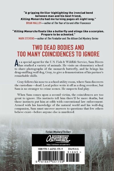 "As a special agent for the US Fish & Wildlife Service, Sam Rivers has researched and studied a variety of animals. He's visiting sixth graders at Hopkins Elementary to share photographs of the Monarch butterfly-and he's brought along his drug-sniffing wolf-dog, Gray, to give students a demonstration of his partner's remarkable skills. Gray finds a sample drug packet, hidden by Sam, but that's not all. The wolf-dog keeps following his nose, leading Sam to a utility room where they discover the school's janitor, dead. Local police write it off as a drug overdose, but Sam is no stranger to crime…mehr