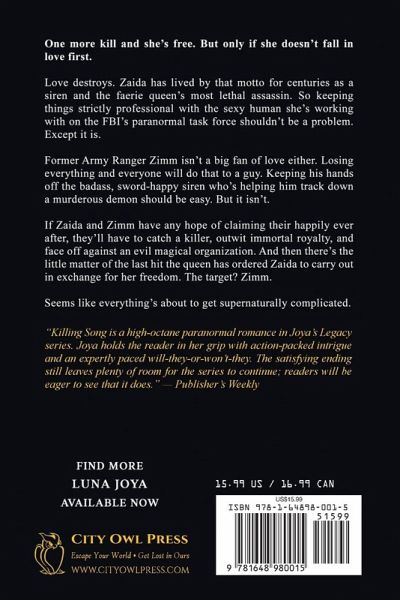 One more kill and she's free. But only if she doesn't fall in love first. Love destroys. Zaida has lived by that motto for centuries as a siren and the faerie queen's most lethal assassin. So keeping things strictly professional with the sexy human she's working with on the FBI's paranormal task force shouldn't be a problem. Except it is. Former Army Ranger Zimm isn't a big fan of love either. Losing everything and everyone will do that to a guy. Keeping his hands off the badass, sword-happy siren who's helping him track down a murderous demon should be easy. But it isn't. If Zaida and Zimm have any hope of claiming their happily ever after, they'll have to catch a killer, outwit immortal royalty, and face off against an evil magical organization. And then there's the little matter of the last hit the queen has ordered Zaida to carry out in exchange for her freedom. The target? Zimm. Seems like everything's about to get supernaturally complicated.