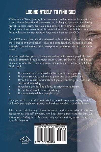 Killing the CEO is my journey from competence to burnout and back again. It's a story of transformation that traverses the challenging landscape of leadership growth, success, stress, depression and anxiety. It's a story of a brutal reality check, where I had to confront the foundation of my core beliefs, values and faith to discover my true identity. Apparently, I am not the CEO. The CEO was a false identity, obsessed with working hard and achieving more. Fueled by flawed beliefs, values and attitudes, the CEO gained strength through repeated actions, social recognition, promotion and even financial reward. After two and a half years of intense mental turmoil, extreme physical fatigue, radically diminished social capacity and total spiritual dryness, I found myself at rock bottom. There at the bottom, not only did I find myself; I found God...again. If you are driven to succeed and live your life for a purpose... If you are striving to achieve, to please and to be productive... If you find yourself constantly on high alert but struggling with clarity and decision making... If you have ever felt like a fraud, an imposter or a failure... If your list of shoulds is overwhelming... If you are fatigued, but struggle to rest... Then you need to read this book. We have a lot in common. Killing the CEO will make you laugh, cry, grimace and perhaps wonder...could this be me? Join me on this journey of transformation and explore what it took to rediscover my true self, my faith, new hope, fresh purpose and freedom. On this journey Killing the CEO was my only option, and as you will discover, it may also be yours.