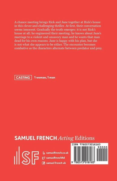 A chance meeting brings Rick and Jane together at Rick's house in this clever and challenging thriller. At first, their conversation seems innocent. Gradually the truth emerges: it is not Rick's house at all; he engineered their meeting; he knows about Jane's marriage to a violent and unsavory man and he wants that man dead for his own reasons. Jane is happy with his plan, but she is not what she appears to be either. The encounter becomes combative as the characters alternate between predator and prey.1 woman, 1 man