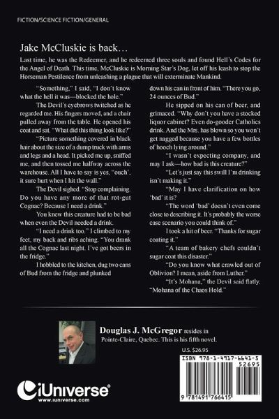 Jake McCluskie is back… Last time, he was the Redeemer, and he redeemed three souls and found Hell's Codes for the Angel of Death. This time, McCluskie is Morning Star's Dog, let off his leash to stop the Horseman Pestilence from unleashing a plague that will exterminate Mankind. "Something," I said, "I don't know what the hell it was-blocked the hole." The Devil's eyebrows twitched as he regarded me. His fingers moved, and a chair pulled away from the table. He opened his coat and sat. "What did this thing look like?" "Picture something covered in black hair about the size of a dump truck with arms and legs and a head. It picked me up, sniffed me, and then tossed me halfway across the warehouse. All I have to say is yes, "ouch', it sure hurt when I hit the wall." The Devil sighed. "Stop complaining. Do you have any more of that rot-gut Cognac? Because I need a drink." You knew this creature had to be bad when even the Devil needed a drink. "I need a drink too." I climbed to my feet, my back and ribs aching. "You drank all the Cognac last night. I've got beers in the fridge." I hobbled to the kitchen, dug two cans of Bud from the fridge and plunked down his can in front of him. "There you go, 24 ounces of Bud." He sipped on his can of beer, and grimaced. "Why don't you have a stocked liquor cabinet? Even do-gooder Catholics drink. And the Mrs. has blown so you won't get nagged because you have a few bottles of hooch lying around." "I wasn't expecting company, and may I ask-how bad is this creature?" "Let's just say this swill I'm drinking isn't making it." "May I have clarification on how 'bad' it is? "The word 'bad' doesn't even come close to describing it. It's probably the worse case scenario you could think of." I took a hit of beer. "Thanks for sugar coating it." "A team of bakery chefs couldn't sugar coat this disaster." "Do you know what crawled out of Oblivion? I mean, aside from Luther." "It's Mohana," the Devil said flatly. "Mohana of the Chaos Hold."