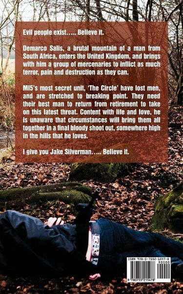Evil people exist..... Believe it. Demarco Salis, a brutal mountain of a man from South Africa, enters the United Kingdom, and brings with him a group of mercenaries to inflict as much terror, pain and destruction as they can. MI5's most secret unit, 'The Circle' have lost men, and are stretched to breaking point. They need their best man to return from retirement to take on this latest threat. Content with life and love, he is unaware that circumstances will bring them all together in a final bloody shoot out, somewhere high in the hills that he loves. I give you Jake Silverman..... Believe it.