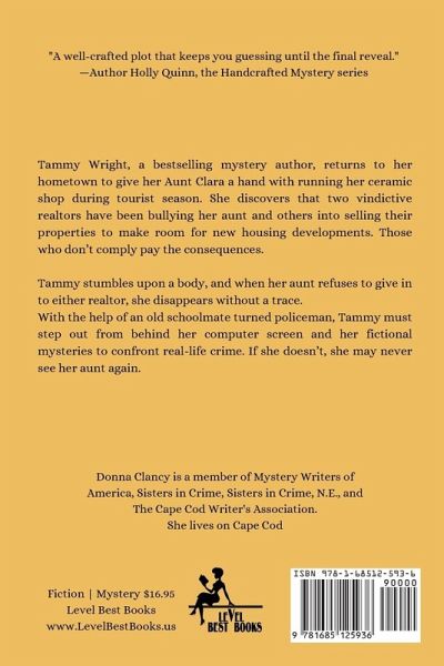 Tammy Wright, a bestselling mystery author, returns to her hometown to give her Aunt Clara a hand with running her ceramic shop during tourist season. She discovers that two vindictive realtors have been bullying her aunt and others into selling their properties to make room for new housing developments. Those who don't comply pay the consequences. Tammy stumbles upon a body, and when her aunt refuses to give in to either realtor, she disappears without a trace. With the help of an old schoolmate turned policeman, Tammy must step out from behind her computer screen and her fictional mysteries to confront real-life crime. If she doesn't, she may never see her aunt again.