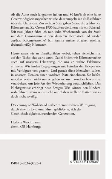Als die Autos noch langsamer fuhren und 80 km/h als eine hohe Geschwindigkeit angesehen wurde, da strampelte ich als Radfahrer über die Chausseen. Zur rechten Seite gaben Steine die gefahrenen Kilometer an. Zu Ostern 1935 kauften die Eltern mir ein Fahrrad. Seit zwei Jahren fahre ich nun jedes Wochenende von der Stadt mit dem Gymnasium in den kleineren Heimatort und wieder zurück. Kilometersteine? Ich kannte meine Strecke, zweimal dreiunddreißig Kilometer. Heute rasen wir an Plastikpfählen vorbei, sehen vielleicht mal auf den Tacho; das war's dann. Dabei finden wir Kilometersteine auch auf unserem Lebensweg, die uns an wahre Erlebnisse erinnern. Wir finden Begegnungen mit Feinden des Krieges wie mit Verfolgten von gestern. Und gerade diese Menschen sollten in unserem Denken einen vorderen Platz einnehmen. Sie helfen uns, das Gestern nicht nur vergehen zu lassen, sondern bewusst zu verarbeiten, um jede Art der Wiederholung auszuschließen. Das Nichtsgewusst erbringt neue Erreger. Was könnte den Kindern widerfahren, wenn wir's nicht wahrhaben wollen? Hätten wir es doch nicht so eilig. Der errungene Wohlstand entbehrt einer rechten Würdigung, durch eine im Leid unerfahren gebliebene, sich der Geschichtslosigkeit zuwendenden Generation.