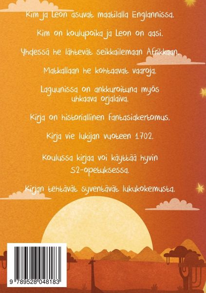 Kim ja Leon asuvat maatilalla Englannissa. Kim on koulupoika ja Leon on aasi. Yhdessä he lähtevät seikkailemaan Afrikkaan. Matkallaan he kohtaavat vaaroja. Laguunissa on ankkuroituna myös uhkaava orjalaiva. Kirja on historiallinen fantasiakertomus. Kirja vie lukijan vuoteen 1702. Koulussa kirjaa voi käyttää hyvin S2-opetuksessa. Kirjan tehtävät syventävät lukukokemusta.