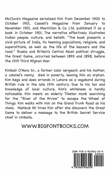 McClure's Magazine serialized Kim from December 1900 to October 1901, Cassell's Magazine from January to November 1901, and Macmillan & Co. Ltd. published it as a book in October 1901. The narrative effectively illustrates Indian people, culture, and beliefs. "The book presents a vivid picture of India, its teeming populations, religions, and superstitions, as well as the life of the bazaars and the road." Russia and Britain's Central Asian political struggle, the Great Game, occurred between 1893 and 1898, before the 1919 Third Afghan War. Kimball O'Hara Sr., a former color sergeant, and his mother, a colonel's nanny, died in poverty, leaving Kim an orphan. Kim begs and does errands in Lahore as a vagabond during British rule in the late 19th century. Due to his tan and knowledge of local culture, Kim's whiteness is hardly noticeable. Kim meets an elderly Tibetan monk searching for the "River of the Arrow" to escape the Wheel of Things. Kim walks with him on the Grand Trunk Road as his chela. Mahbub Ali hires Kim after she discovers the Great Game to deliver a message to the British Secret Service chief in Umballa.