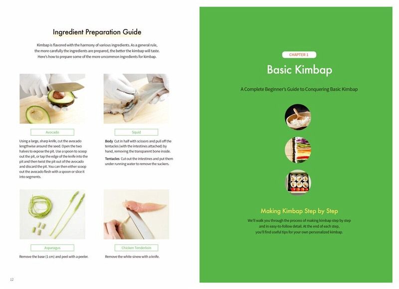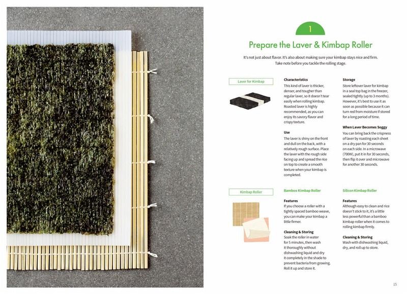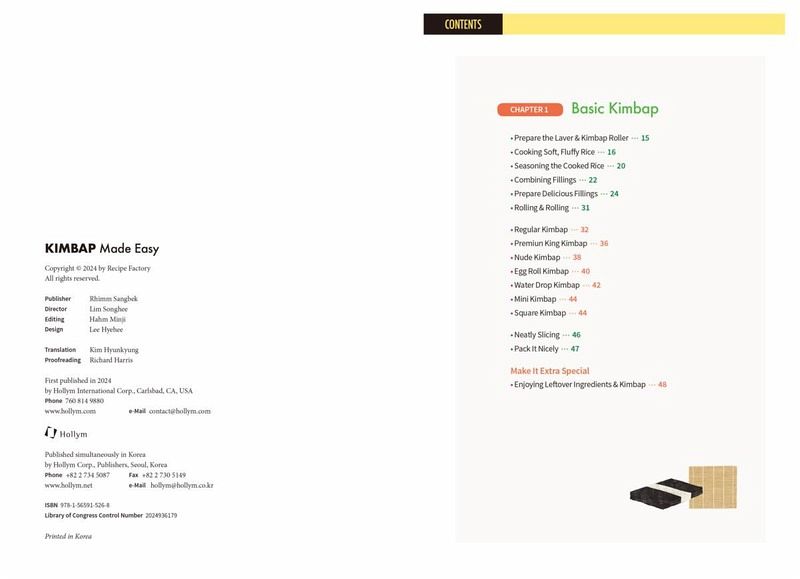 CHAPTER 1 Basic Kimbap - Prepare the Laver & Kimbap Roller --- 15 - Cooking Soft, Fluffy Rice --- 16 - Seasoning the Cooked Rice --- 20 - Combining Fillings --- 22 - Prepare Delicious Fillings --- 24 - Rolling & Rolling --- 31 - Regular Kimbap --- 32 - Premiun King Kimbap --- 36 - Nude Kimbap --- 38 - Egg Roll Kimbap --- 40 - Water Drop Kimbap --- 42 - Mini Kimbap --- 44 - Square Kimbap --- 44 - Neatly Slicing --- 46 - Pack It Nicely --- 47 Make It Extra Special - Enjoying Leftover Ingredients & Kimbap --- 48 CHAPTER 2 Non-spicy Kimbap - Family Kimbap --- 52 - Chicken Breast & Coleslaw Kimbap --- 54 - Asparagus Kimbap --- 56 - Flower Kimbap --- 58 - Kabocha Squash & Tteokgalbi Kimbap --- 60 - Smiley Kimbap --- 62 - Smoked Duck Nude Kimbap --- 64 - Bassak Bulgogi & Water Parsley Kimbap --- 66 - Pork Cutlet Kimbap --- 68 - Omelet Rice Kimbap --- 70 - Avocado & Crab Meat Kimbap --- 72 - Teriyaki Shrimp Kimbap --- 74 - Sprout Salad & Tuna Kimbap --- 76 - Eel Kimbap --- 78 - Salmon Kimbap --- 80 - Cucumber Cream Cheese Nude Kimbap --- 82 - Pollock Roe Kimbap --- 84 - Namul Kimbap --- 86 - Addictive Kimbap --- 88 - Buckwheat Kimbap --- 90 Make It Extra Special - Perfect Side Dishes for a Kimbap Lunch Box ---92 CHAPTER 3 Slightly Spicy Kimbap - Seasoned Fried Chicken Kimbap --- 94 - Burger Kimbap --- 96 - Garlic Chives & Bacon Kimbap --- 98 - Jeyuk Ssam Kimbap --- 100 - Jangjorim Kimbap --- 102 - Seasoned Yellow Pickled Radish Kimbap --- 104 - Spam Egg Roll --- 106 - Dried Radish Strips Kimbap --- 108 - Mukeunji Kimbap --- 110 - Dried Squid Strip Kimbap --- 112 - Chungmu Kimbap --- 114 - Tofu Kimchi Kimbap --- 116 Make It Extra Special - Using Side Dishes from the Fridge as Kimbap Ingredients --- 118 CHAPTER 4 Extra Spicy Kimbap - Spicy Yakgochujang Kimbap --- 120 - Chili Tuna Kimbap --- 122 - Hot Squid Kimbap --- 124 - Spicy Fish Cake Kimbap --- 126 - Myeolchu Kimbap --- 128 - Spicy Nuts Kimbap --- 130 - Ttaengcho Kimbap --- 132 Make It Extra Special - Soups to Pair with Spicy Kimbap --- 134