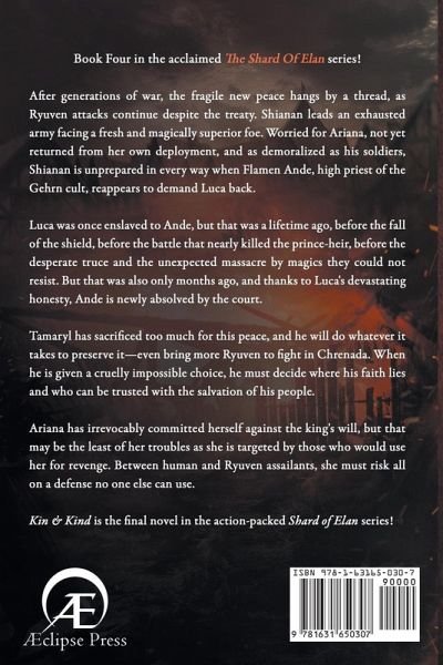 After generations of war, the fragile new peace hangs by a thread, as Ryuven attacks continue despite the treaty. Shianan leads an exhausted army facing a fresh and magically superior foe. Worried for Ariana, not yet returned from her own deployment, and as demoralized as his soldiers, Shianan is unprepared in every way when Flamen Ande, high priest of the Gehrn cult, reappears to demand Luca back. Luca was once enslaved to Ande, but that was a lifetime ago, before the fall of the shield, before the battle that nearly killed the prince-heir, before the desperate truce and the unexpected massacre by magics they could not resist. But that was also only months ago, and thanks to Luca's devastating honesty, Ande is newly absolved by the court. Tamaryl has sacrificed too much for this peace, and he will do whatever it takes to preserve it-even bring more Ryuven to fight in Chrenada. When he is given a cruelly impossible choice, he must decide where his faith lies and who can be trusted with the salvation of his people. Ariana has irrevocably committed herself against the king's will, but that may be the least of her troubles as she is targeted by those who would use her for revenge. Between human and Ryuven assailants, she must risk all on a defense no one else can use. Great for fans of military fantasy and adventure, Kin & Kind is the final novel in the action-packed Shard of Elan series!