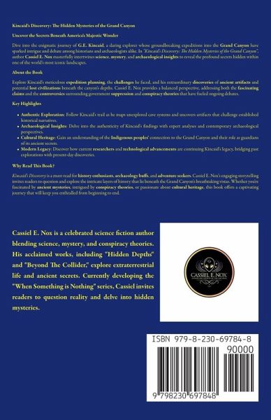 Kincaid's Discovery: The Hidden Mysteries of the Grand Canyon Uncover the Secrets Beneath America's Majestic Wonder Dive into the enigmatic journey of G.E. Kincaid, a daring explorer whose groundbreaking expeditions into the Grand Canyon have sparked intrigue and debate among historians and archaeologists alike. In "Kincaid's Discovery: The Hidden Mysteries of the Grand Canyon", author Cassiel E. Nox masterfully intertwines science, mystery, and archaeological insights to reveal the profound secrets hidden within one of the world's most iconic landscapes. About the Book Explore Kincaid's meticulous expedition planning, the challenges he faced, and his extraordinary discoveries of ancient artifacts and potential lost civilizations beneath the canyon's depths. Cassiel E. Nox provides a balanced perspective, addressing both the fascinating claims and the controversies surrounding government suppression and conspiracy theories that have fueled ongoing debates. Key HighlightsAuthentic Exploration: Follow Kincaid's trail as he maps unexplored cave systems and uncovers artifacts that challenge established historical narratives. Archaeological Insights: Delve into the authenticity of Kincaid's findings with expert analyses and contemporary archaeological perspectives. Cultural Heritage: Gain an understanding of the Indigenous peoples' connection to the Grand Canyon and their role as guardians of its ancient secrets. Modern Legacy: Discover how current researchers and technological advancements are continuing Kincaid's legacy, bridging past explorations with present-day discoveries. Why Read This Book? Kincaid's Discovery is a must-read for history enthusiasts, archaeology buffs, and adventure seekers. Cassiel E. Nox's engaging storytelling invites readers to question and explore the intricate layers of history that lie beneath the Grand Canyon's breathtaking vistas. Whether you're fascinated by ancient mysteries, intrigued by conspiracy theories, or passionate about cultural heritage, this book offers a captivating journey that will keep you enthralled from beginning to end.
