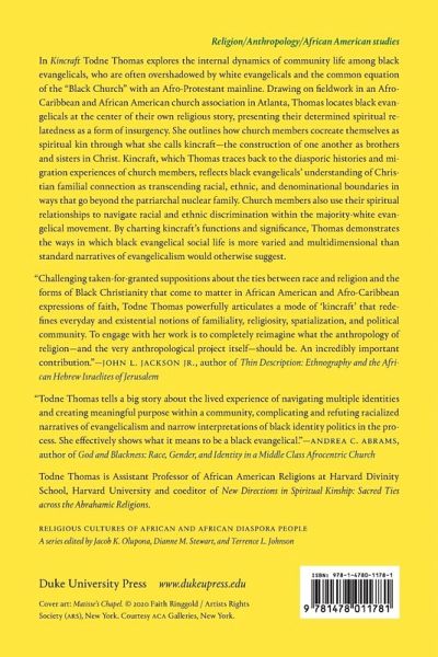 In Kincraft Todne Thomas explores the internal dynamics of community life among black evangelicals, who are often overshadowed by white evangelicals and the common equation of the "Black Church" with an Afro-Protestant mainline. Drawing on fieldwork in an Afro-Caribbean and African American church association in Atlanta, Thomas locates black evangelicals at the center of their own religious story, presenting their determined spiritual relatedness as a form of insurgency. She outlines how church members cocreate themselves as spiritual kin through what she calls kincraft-the construction of one another as brothers and sisters in Christ. Kincraft, which Thomas traces back to the diasporic histories and migration experiences of church members, reflects black evangelicals' understanding of Christian familial connection as transcending racial, ethnic, and denominational boundaries in ways that go beyond the patriarchal nuclear family. Church members also use their spiritual relationships to navigate racial and ethnic discrimination within the majority-white evangelical movement. By charting kincraft's functions and significance, Thomas demonstrates the ways in which black evangelical social life is more varied and multidimensional than standard narratives of evangelicalism would otherwise suggest.
