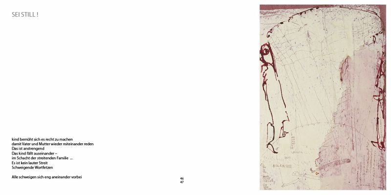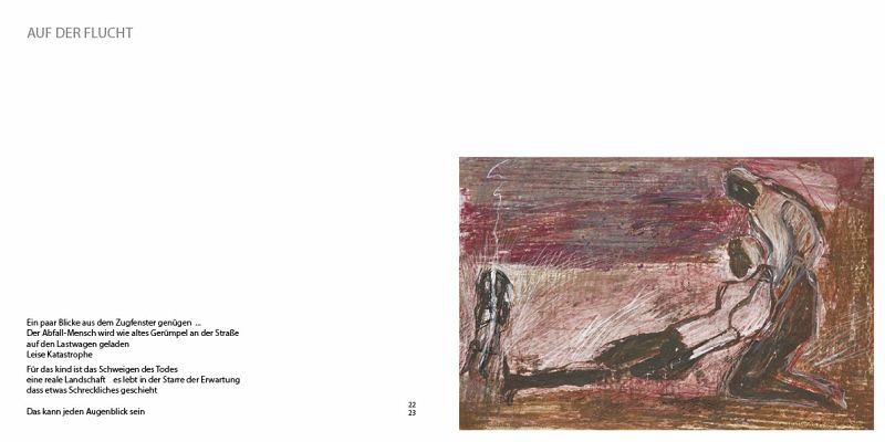 Die Texte und Bilder sind ein Zeugnis menschlichen Ringens und Bemühens um Bewältigung einer Bedrohung, die alle rein menschlichen Möglichkeiten überfordert.(Klemens Schaupp)Das kind lebtin der Starre der Erwartungdass etwas Schreckliches geschiehtDas kann jeden Augenblick sein(Christamaria Schröter )