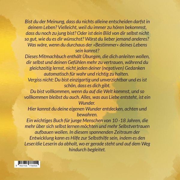 Bist du der Meinung, dass du nichts alleine entscheiden darfst in deinem Leben? Vielleicht, weil du immer zu hören bekommst, dass du noch zu jung bist? Oder ist dein Bild von dir selbst nicht so gut, wie du es dir wünschst? Wärst du lieber jemand anderes? Was wäre, wenn du durchaus der »Bestimmer« deines Lebens sein kannst?Dieses Mitmachbuch enthält Übungen, die dich anleiten wollen, dir selbst und deinen Gefühlen mehr zu vertrauen, während du gleichzeitig lernst, nicht jeden deiner (negativen) Gedanken automatisch für wahr und richtig zu halten. Vergiss nicht: Du bist einzigartig und unverzichtbar und es ist schön, dass es dich gibt.Du bist vollkommen, wenn du auf die Welt kommst, und so vollkommen bleibst du auch. Alles, was aus Liebe entsteht, ist ein Wunder. Hier kannst du deine eigenen Wunder entdecken, achten und bewahren.Ein wichtiges Buch für junge Menschen von 10 -18 Jahren, die mehr über sich selbst lernen möchten und mehr Selbstvertrauen aufbauen wollen. In diesem spannenden Zeitraum der Entwicklung kann es Hilfe zur Selbsthilfe sein, indem es den Leser/die Leserin da abholt, wo er gerade steht und auf dem Weg hindurch begleitet.