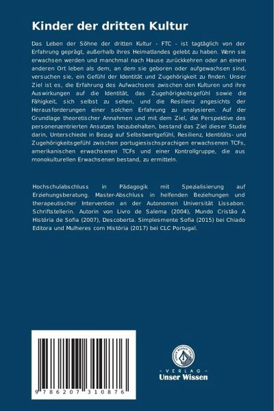 Das Leben der Söhne der dritten Kultur - FTC - ist tagtäglich von der Erfahrung geprägt, außerhalb ihres Heimatlandes gelebt zu haben. Wenn sie erwachsen werden und manchmal nach Hause zurückkehren oder an einem anderen Ort leben als dem, an dem sie geboren oder aufgewachsen sind, versuchen sie, ein Gefühl der Identität und Zugehörigkeit zu finden. Unser Ziel ist es, die Erfahrung des Aufwachsens zwischen den Kulturen und ihre Auswirkungen auf die Identität, das Zugehörigkeitsgefühl sowie die Fähigkeit, sich selbst zu sehen, und die Resilienz angesichts der Herausforderungen einer solchen Erfahrung zu analysieren. Auf der Grundlage theoretischer Annahmen und mit dem Ziel, die Perspektive des personenzentrierten Ansatzes beizubehalten, bestand das Ziel dieser Studie darin, Unterschiede in Bezug auf Selbstwertgefühl, Resilienz, Identitäts- und Zugehörigkeitsgefühl zwischen portugiesischsprachigen erwachsenen TCFs, amerikanischen erwachsenen TCFs und einer Kontrollgruppe, die aus monokulturellen Erwachsenen bestand, zu ermitteln.