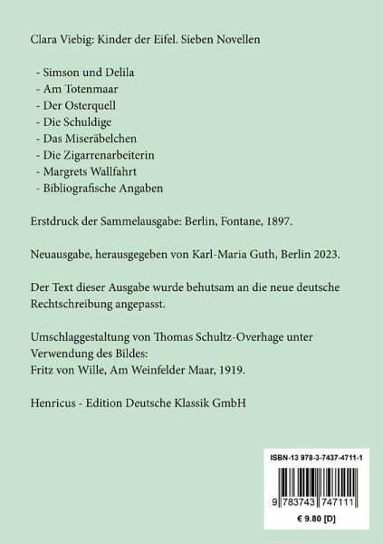 Clara Viebig: Kinder der Eifel. Sieben NovellenErstdruck der Sammelausgabe: Berlin, Fontane, 1897.Inhaltsverzeichnis:Kinder der Eifel.Simson und Delila.Am Totenmaar.Der Osterquell.Die Schuldige.Das Miseräbelchen.Die Zigarrenarbeiterin.Margrets Wallfahrt.Bibliografische Angaben.Neuausgabe, herausgegeben von Karl-Maria Guth, Berlin 2023.Der Text dieser Ausgabe wurde behutsam an die neue deutsche Rechtschreibung angepasst.Umschlagabbildung: Fritz von Wille, Am Weinfelder Maar, 1919Gesetzt aus der Minion Pro, 11 pt.Die Sammlung Hofenberg erscheint im Verlag Henricus - Edition Deutsche Klassik GmbH, Berlin