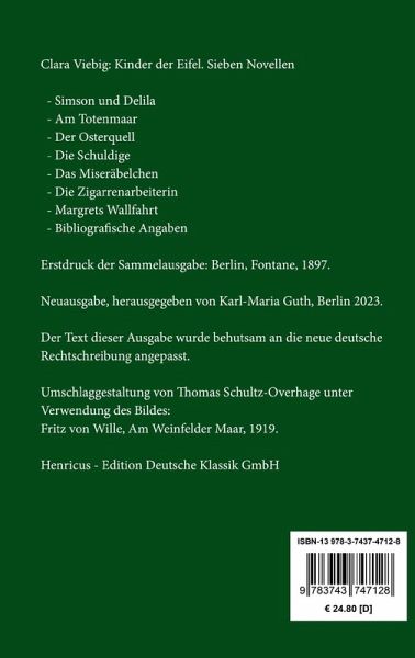 Clara Viebig: Kinder der Eifel. Sieben NovellenErstdruck der Sammelausgabe: Berlin, Fontane, 1897.Inhaltsverzeichnis:Kinder der Eifel.Simson und Delila.Am Totenmaar.Der Osterquell.Die Schuldige.Das Miseräbelchen.Die Zigarrenarbeiterin.Margrets Wallfahrt.Bibliografische Angaben.Neuausgabe, herausgegeben von Karl-Maria Guth, Berlin 2023.Der Text dieser Ausgabe wurde behutsam an die neue deutsche Rechtschreibung angepasst.Umschlagabbildung: Fritz von Wille, Am Weinfelder Maar, 1919Gesetzt aus der Minion Pro, 11 pt.Die Sammlung Hofenberg erscheint im Verlag Henricus - Edition Deutsche Klassik GmbH, Berlin