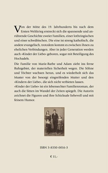Von der Mitte des 19. Jahrhunderts bis nach dem Ersten Weltkrieg erstreckt sich die spannende und anrührende Geschichte zweier Familien, einer lothringischen und einer schwäbischen. Die eine ist streng katholisch, die andere evangelisch, trotzdem kommt es zwischen ihnen zu ehelichen Verbindungen. Aber in jeder Generation werden auch ¿Kinder der Liebe¿ geboren, sogar mit Beteiligung des Hochadels. Die Familie von Marie-Barbe und Adam zieht ins ferne Ruhrgebiet, der materiellen Sicherheit wegen. Die Söhne und Töchter wachsen heran, und es wiederholt sich das Muster von der besorgt eingreifenden Mutter und den ¿Kinder der Liebe¿, die sich nicht verbieten lassen. ¿Kinder der Liebe¿ ist ein lebensechter Familienroman, der auch die Sitten im Wandel der Zeiten spiegelt. Die Autorin zeichnet die Figuren und ihre Schicksale liebevoll und mit feinem Humor.