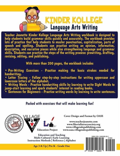 Teacher Jeanette Kinder Kollege Language Arts Writing workbook is designed to help students build grammar skills quickly and accurately. The workbook provides lots of practice that help students to master punctuation, capitalization, parts of speech and spelling. Students can practice writing an opinion, informative, descriptive, and narrative pieces while also strengthening language and grammar skills. Students can practice the steps of the writing process: prewriting, drafting, revising, editing, and publishing. With more than 200 pages, the workbook includes Pre-Writing Exercises - Practice making the basic strokes needed for handwriting. Letter Tracing - Follow step-by-step instructions for writing uppercase and lowercase letters of the alphabet. Writing Words - Practice handwriting skills by learning to write Sight Words to jump-start learning and spark students’ interest in reading books. Sentences for Beginners - Practice writing words by learning to write sentences. Alphabet Coloring makes writing words fun.
