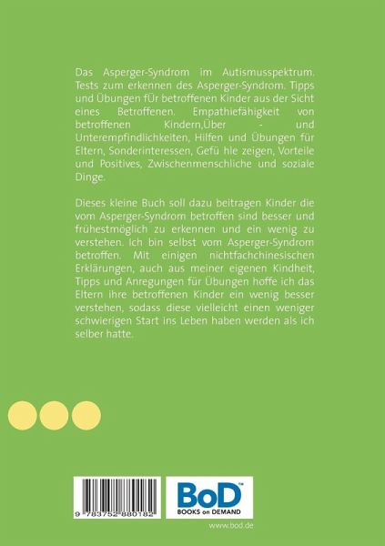 Das Asperger-Syndrom im Autismusspektrum. Tests zum erkennen des Asperger-Syndrom. Tipps und Übungen fÜr betroffenen Kinder aus der Sicht eines Betroffenen. Empathiefähigkeit von betroffenen Kindern,Über - und Unterempfindlichkeiten, Hilfen und Übungen für Eltern, Sonderinteressen, Gefü hle zeigen, Vorteile und Positives, Zwischenmenschliche und soziale Dinge.Dieses kleine Buch soll dazu beitragen Kinder die vom Asperger-Syndrom betroffen sind besser und frühestmöglich zu erkennen und ein wenig zu verstehen. Ich bin selbst vom Asperger-Syndrom betroffen. Mit einigen nichtfachchinesischen Erklärungen, auch aus meiner eigenen Kindheit, Tipps und Anregungen für Übungen hoffe ich das Eltern ihre betroffenen Kinder ein wenig besser verstehen, sodass diese vielleicht einen weniger schwierigen Start ins Leben haben werden als ich selber hatte.