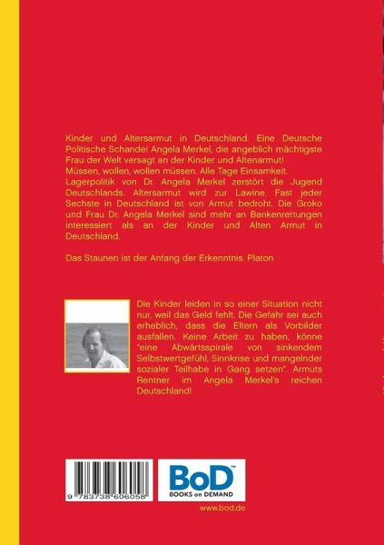 Kinder und Altersarmut in DeutschlandEine Deutsche Politische SchandeAngela Merkel, die angeblich mächtigste Frau der Welt versagt an Kinder und Altenarmut!Das Staunen ist der Anfang der Erkenntnis. PlatonMüssen, wollen, wollen müssen. Alle Tage Einsamkeit. Regierungs Lagerpolitik von Merkel zerstört die Jugend Deutschlands. Altersarmut wird zur LawineFast jeder Sechste in Deutschland ist von Armut bedroht. Das sind rund 13 Millionen Menschen, wie das Statistische Bundesamt in Wiesbaden für das ..Der Koalitionsvertrag von Union und SPD befasst sich mit so ziemlich allem, was die Welt bewegt. Selbst Randthemen in der politischen Diskussion wie "selbstbestimmtes Älterwerden", Heimatvertriebene oder der Zivilschutz werden darin gestreift. Um so erstaunlicher ist, dass das Wort Kinderarmut in dem 138 Seiten starken Werk überhaupt nicht auftaucht - und das, obwohl die Zahl der Kinder, die auf Hartz IV angewiesen ist, zuletzt wieder zugenommen hat.Ein älterer Herr fährt in seinem Rollstuhl mit der Aufschrift "Flasche leer? Dankesehr!" durch die Fußgängerzone von Potsdam. Er will als Flaschensammler etwas Geld dazu verdienen. Die OECD befürchtet, dass Deutschland in den kommenden Jahren ein erhebliches Problem mit Altersarmut bekommen wirdWas ist der Unterschied zwischen einem englischen, einem französischen und einem deutschen Rentner? Der englische Rentner steht morgens um neun auf, trinkt seinen Tee und liest die Zeitung. Der französische steht um zehn auf, genehmigt sich ein Gläschen Bordeaux und macht danach einen ausgedehnten Spaziergang. Und der deutsche Rentner? Steht um sechs auf, nimmt seine Herztropfen und geht anschließend zur Arbeit.
