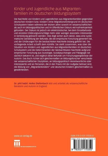 Die Nachteile von Kindern und Jugendlichen aus Migrantenfamilien gegenüber deutschen Kindern bzw. Kindern ohne Migrationshintergrund im deutschen Schulsystem haben während der letzten Jahre sowohl im wissenschaftlichen als auch im bildungspolitischen und im öffentlichen Diskurs viel Aufmerksamkeit gefunden. Der Diskurs ist jedoch ein eklektizistischer, bei dem Einzelbefunde und einzelne Erklärungsvorschläge mehr oder weniger assoziativ miteinander in Verbindung gebracht werden. Dies liegt sicher auch daran, dass eine systematische Darstellung der Befunde, die die empirische Forschung generiert hat, und der Erklärungen für die beobachteten Nachteile bislang gefehlt hat. Die vorliegende Arbeit schafft dem Abhilfe: Sie stellt zusammen, was über die Situation von Kindern und Jugendlichen aus Migrantenfamilien im deutschen Schulsystem und die Determinanten der beobachtbaren Nachteile aufgrund empirischer Forschung aus Soziologie, Sozialpsychologie und Pädagogik tatsächlich bekannt ist, und ergänzt diese Befunde um Forschungsergebnisse der Autorin. Das Buch richtet sich gleichermaßen an Bildungsforscher verschiedener wissenschaftlicher Disziplinen, an bildungspolitisch Verantwortliche oder Interessierte und an Personen, die in der Praxis mit der Aufgabe betraut sind, die Bildung von "Migrantenkindern" und deutschen Kindern gleichermaßen zu gewährleisten.