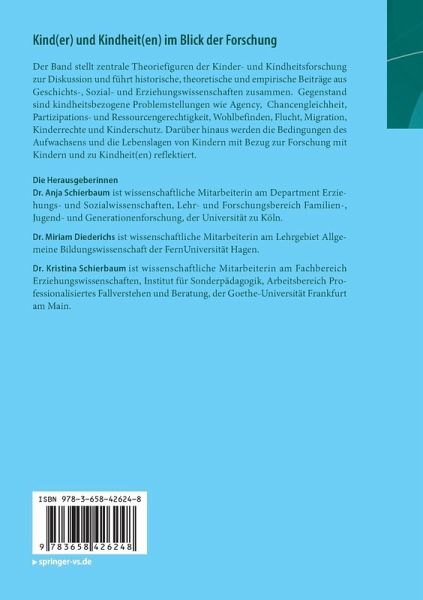 Historische Perspektiven: Kinder, Kindheiten, Kindheitsgeschichte.- Topos Straßenkindheit: Zum disziplinären Gedächtnis der Kindheitsforschung.- "Kindheitsrhetorik revisited": Wissen, Diskurs und Praxis als konzeptionelle Pfeiler einer integrativen Kindheitswissenschaft.- Children's agency - Kinder als Akteure.- Agency in der Kindheitsforschung revisited - eine interdisziplinäre Annäherung.- The normative pattern of 'good childhood' and intergenerational relations.- Child Well-being als Zugang zu Lebenswelten, Lebenslagen und Bildungsräumen.- Ungleichheiten in der Kindheit.- Kinderrechte zwischen Paternalismus und Autonomie. Das Unbehagen an der Erziehung und die Ambivalenz der Kinderrechte.- Theoriefiguren des Kindeswohls - Kindheitsforschung und Kinderschutz im Gespräch.- Die Unsichtbarkeit der Kinder im Kinderschutz. Zur sozialwissenschaftlichen Rezeption eines kindheitssoziologischen Befundes.- Herausforderungen und Methoden der Erforschung von Kinderperspektiven im Rahmen der Kindheitsforschung.- Aufwachsen in heterogenen Familien der Migrationsgesellschaft. Unter besonderer Berücksichtigung der Arbeit mit Bilderbüchern in Kitas.- Gutes Ankommen - eine multimethodische Annäherung an die Perspektiven von geflüchteten Kindern.- Generationale Ordnungen zwischen Familie, Zuhause und Schule: Positionen von Kindern und Lehrkräften zum Hausbesuch (noch offen).- Partizipative Forschung und Kindheitsforschung: Kinder als commoners?.- Ein Plädoyer für das partizipative Forschen mit trauernden Kindern.- Ethnomethodologisch-videographische Kindheitsforschung - Akteurschaft und soziale Ordnung sichtbar machen.