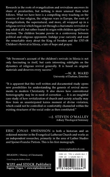 Research in the roots of evangelicalism and revivalism uncovers its share of peculiarities, but nothing is more unusual than what follows. What we have here is a compelling story touching on the exercise of free religion, the religious wars in Europe, the roots of Evangelicalism, the supernatural, and more, all wrapped up in a religious revival which began not through a charismatic revivalist or any adult at all, but rather found it's origin with children aged four to fourteen. The children became pawns in a controversy between political and religious opponents. Indulge your curiosity and read the remarkable story about the King of Sweden and the 1707-08 Children's Revival in Silesia, a tale of hope and prayer.
