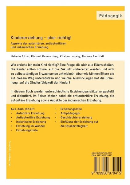Wie erziehe ich mein Kind richtig? Eine Frage, die sich alle Eltern stellen. Die Kinder sollen optimal auf die Zukunft vorbereitet werden und sich zu selbstständigen Erwachsenen entwickeln. Aber wie können Eltern sie auf diesem Weg unterstützen und welche Auswirkungen hat die Erziehung auf die Studierfähigkeit der Kinder?In diesem Buch werden unterschiedliche Erziehungsansätze vorgestellt und diskutiert. Im Fokus stehen dabei die antiautoritäre Erziehung, die autoritäre Erziehung sowie Aspekte der indianischen Erziehung. Aus dem Inhalt: Autoritäre Erziehung, Antiautoritäre Erziehung, indianische Erziehung, Erziehung im Wandel, Erziehungsziele, Erziehungsstile, Antipädagogik, Geschlechtererziehung, Einflüsse der Erziehung auf die Studierfähigkeit.