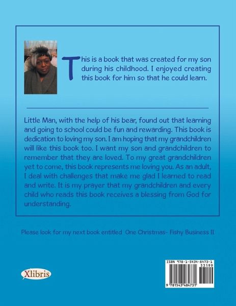 This is a book that was created for my son during his childhood. I enjoyed creating this book for him so that he could learn. Little Man, with the help of his bear, found out that learning and going to school could be fun and rewarding. This book is dedication to loving my son. I am hoping that my grandchildren will like this book too. I want my son and grandchildren to remember that they are loved. To my great grandchildren yet to come, this book represents me loving you. As an adult, I deal with challenges that make me glad I learned to read and write. It is my prayer that my grandchildren and every child who reads this book receives a blessing from God for understanding.