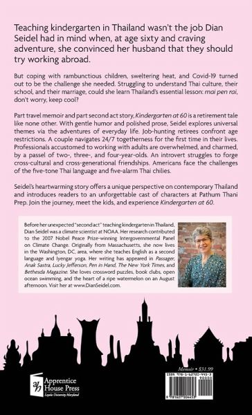 Teaching kindergarten in Thailand wasn't the job Dian Seidel had in mind when, at age sixty and craving adventure, she convinced her husband that they should try working abroad. But coping with rambunctious children, sweltering heat, and Covid-19 turned out to be the challenge she needed. Struggling to understand Thai culture, their school, and their marriage, could she learn Thailand's essential lesson: mai pen rai, don't worry, keep cool? Part travel memoir and part second act story, Kindergarten at 60 is a retirement tale like none other. With gentle humor and polished prose, Seidel explores universal themes via the adventures of everyday life. Job-hunting retirees confront age restrictions. A couple navigates 24/7 togetherness for the first time in their lives. Professionals accustomed to working with adults are overwhelmed, and charmed, by a passel of two-, three-, and four-year-olds. An introvert struggles to forge cross-cultural and cross-generational friendships. Americans face the challenges of the five-tone Thai language and five-alarm Thai chilies. Seidel's heartwarming story offers a unique perspective on contemporary Thailand and introduces readers to an unforgettable cast of characters at Pathum Thani Prep. Join the journey, meet the kids, and experience Kindergarten at 60.