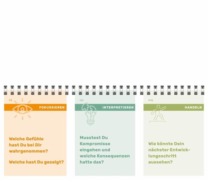 Phase 3, handeln, bedeutet, zukünftige Handlungsoptionen aus den Erkenntnissen der Phasen 1 und 2 abzuleiten. Dazu gehören die Seiten des rechten Fragenstapels.