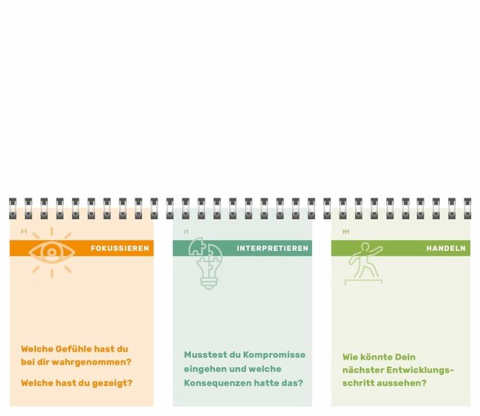 Das Reflexionstool ist ein unverzichtbares Werkzeug, mit dem Fachkräfte gezielt in den dreistufigen Reflexionsprozess starten können. Die Funktionsweise ist denkbar einfach. Rufe dir eine Situation ins Gedächtnis, aus der du Rückschlüsse ziehen möchtest. Wähle aus jedem der drei Fragenstapel eine Seite aus. Finde möglichst detaillierte und differenzierte Antworten auf jede der 3 Fragen. Und los geht's: