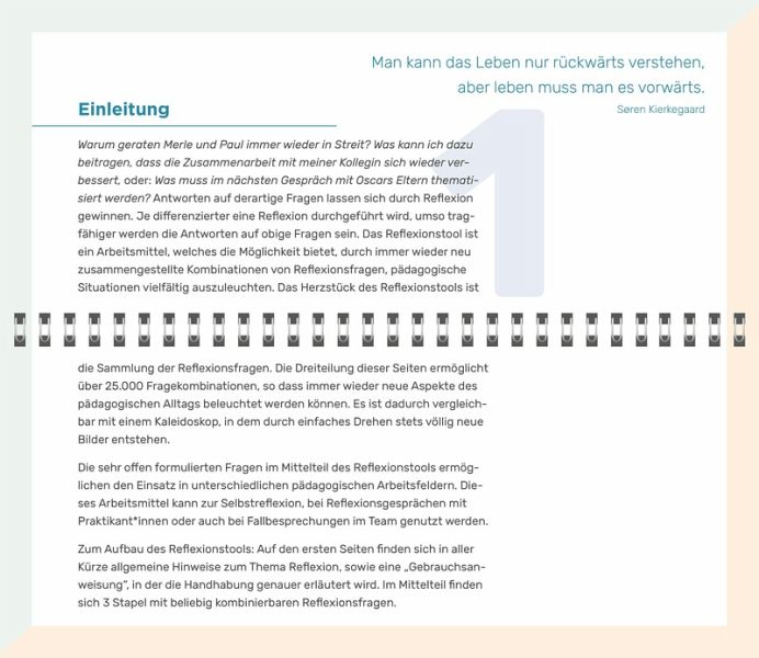 Die Fragen aus den drei Stapeln können beliebig kombiniert werden. Insgesamt ergeben sich so mehr als 25.000 Möglichkeiten und damit eine unendliche Fülle an möglichen Reflexionen!