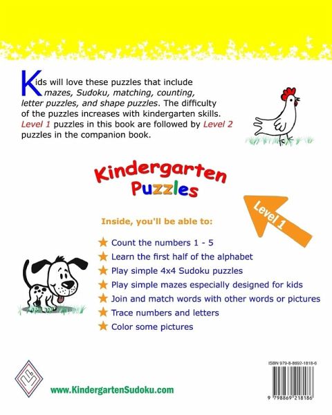 This book contains various puzzles, worksheets, and activities for kids in kindergarten - ages 4-8 years and up. Puzzles include 4x4 sudoku, simple mazes especially designed for kids, counting, matching, letter puzzles, shape puzzles, and number puzzles. Level 1 covers the numbers 1-5 and the first half of the alphabet. The difficulty of the puzzles increases with kindergarten skills. In addition, your kids will also trace some numbers and letters, and color some pictures. Check our website at www.PetraBooks.com for more puzzle books. Level 1 puzzles are followed by Level 2 puzzles in the companion book.