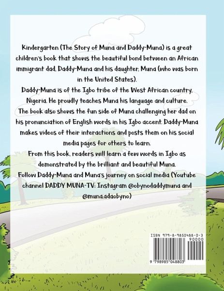 Kindergarten (The Story of Muna and Daddy-Muna) is a book that shows the beautiful bond between a Father, Daddy-Muna and his daughter, Muna. Daddy-Muna is from the Igbo tribe of the West African country, Nigeria. He immigrated to the United States of America to pursue the American dream. Despite living in the United States, he never abandoned his language and culture. He proudly teaches Muna, (who was born in the United States) the Igbo language. Muna enjoys learning the Igbo language and practicing speaking it with her dad. Sometimes, Muna challenges her dad on his pronunciation of English words in his Igbo accent. Daddy-Muna makes videos of their interactions and posts them on his social media pages for others to learn. The book is a great children's book that illustrates a wholesome, happy and fun-loving bond between immigrant parents and their children based on true life experiences of Muna and her dad. You will learn a few words in Igbo as demonstrated by the brilliant and beautiful Muna. Follow Daddy-Muna and Muna's journey on social media at @obynodaddymuna and @muna.adaobyno Youtube channel DADDY MUNA-TV.