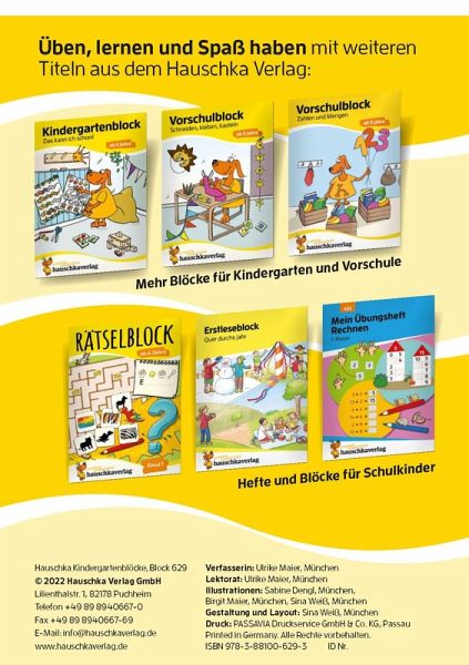 Für ältere Kindergartenkinder ab 5 Jahren eignen sich die Vorschulblöcke zur gezielten Vorbereitung auf die Schule. In abwechslungsreichen Rätseln und Übungen werden die Konzentrationsfähigkeit und das Durchhaltevermögen gefördert. Die liebevoll illustrierten Aufgaben vermitteln erste mathematische und sprachliche Grundlagen und machen die Kinder Schritt für Schritt fit für den Schuleintritt. Die handlichen Blöcke sind der idealen Begleiter - als Reisespiele, bei langen Wartezeiten, Bahnfahrten, im Restaurant, an verregneten Nachmittagen oder einfach zwischendurch - sie bieten jederzeit eine sinnvolle Beschäftigung!