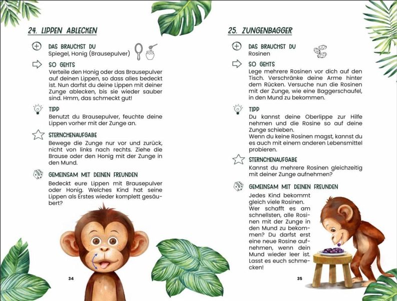 Fördern Sie die Sprachentwicklung Ihres Kindes frühzeitig und spielerisch!Mit diesem Buch beugen Sie Sprach- und Sprechstörungen vor und wecken in Ihrem Kind die Freude am Umgang mit Sprache. Dieses Buch ist ein unverzichtbarer Begleiter für Eltern und Fachkräfte, die die Sprachentwicklung vonKindern unterstützen möchten. Es bietet über 100 Spiele und Übungen, liebevoll gestaltete Illustrationensowie motivierende Video- und Audiodateien - alles alltagstauglich und ohne Vorkenntnisse durchführbar.Fördern Sie die wichtigsten Bereiche der Sprachentwicklung Ihres Kindes und darüber hinaus:- Mundmotorik- Lautbildung- Auditive Wahrnehmung- Phonologische Bewusstheit- Wortschatz- Grammatik- Satzbau- ErzählkompetenzDer kleine Affe Toni führt kindgerecht und unterhaltsam durch die Übungen und sorgt für viel Spaß beim Lernen. Mit den zahlreichen Illustrationen, Videos und Audios kann Ihr Kind die Übungen eigenständig und motiviert durchführen.Entdecken Sie die Freude am spielerischen Lernenund begleiten Sie Ihr Kind auf dem Weg zu einerstarken und sicheren Sprachkompetenz.