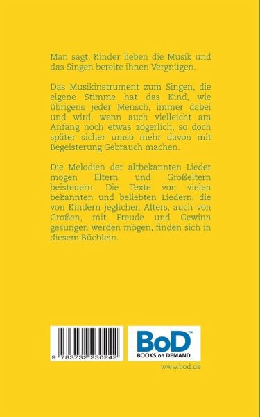 Man sagt, Kinder lieben die Musik und das Singen bereite ihnen Vergnügen. Das Musikinstrument zum Singen, die eigene Stimme hat das Kind, wie übrigens jeder Mensch, immer dabei und wird, wenn auch vielleicht am Anfang noch etwas zögerlich, so doch später sicher umso mehr davon mit Begeisterung Gebrauch machen.Die Melodien der altbekannten Lieder mögen Eltern und Großeltern beisteuern. Die Texte von vielen bekannten und beliebten Liedern, die von Kindern jeglichen Alters, auch von Großen, mit Freude und Gewinn gesungen werden mögen, finden sich in diesem Büchlein.Vorwort zur 3. Auflage:Nachdem das Kinderliederbuch seit mittlerweile einem Jahr aufdem Markt ist, kam die Idee, die Anzahl der Lieder aufzurundenauf volle Einhundert. Dazu habe ich noch einige Advents- undWeihnachtslieder hinzugefügt, so dass die jungen Sängerinnenund Sänger auch beim Musizieren zum Weinachtsfest auf diebewährte Liedersammlung zurückgreifen können.