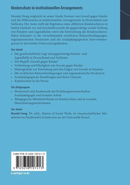 Moonki Hong vergleicht in seiner Studie Formen von Gewalt gegen Kinder und die Hilfesysteme in institutionellen Arrangements in Deutschland und Südkorea. Der Autor stellt die Ergebnisse eines effektiven Kinderschutzes in beiden Ländern vor und beschreibt jeweils die gegenwärtige soziale Stellung von Kindern und Jugendlichen sowie die Entwicklung des Kinderschutzes. Dabei diskutiert er die vorzufindenden rechtlichen Rahmenbedingungen, organisatorischen Strukturen und die sozialpädagogischen Interventionspraxen in den beiden Untersuchungsländern.