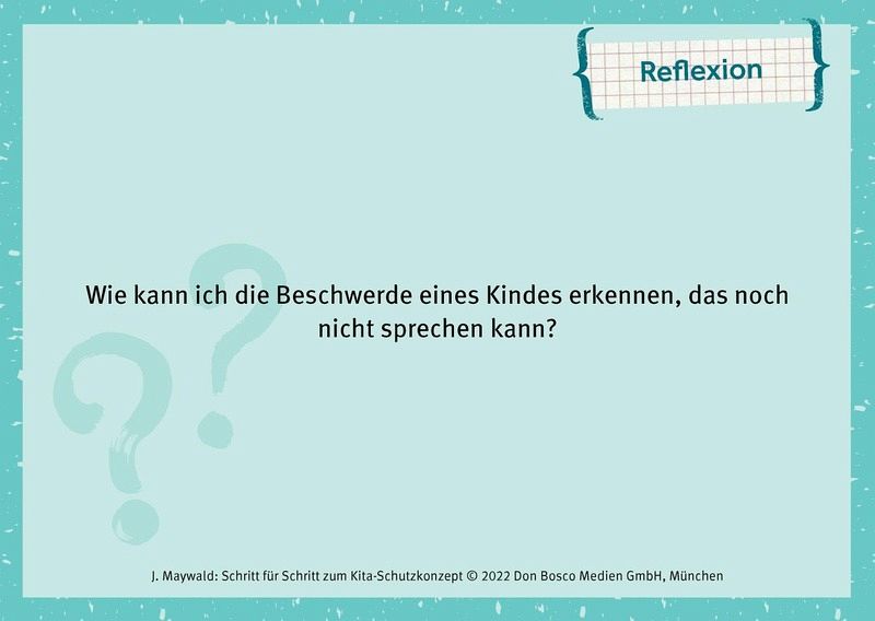 Rechtliche Grundlagen und Anleitungen zur Erstellung eines Kita-SchutzkonzeptesKonfliktgespräche führen: Elternarbeit und Kommunikation im TeamEmotionale Misshandlung und physische Gewalt in der Einrichtung vermeidenMit 35 Bildkarten im A6-Format: Fallbeispiele, Reflexionsfragen und Impulskarten für die Arbeit im TeamInkl. Downloadmaterial: Fragebögen, Gesprächsleitfäden, Checklisten und mehrWeiterbildung für Erzieher:innen in Kita, Hort und Tagespflege