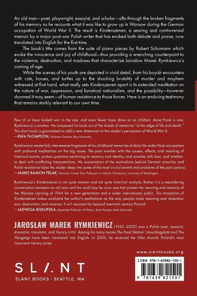 An old man-poet, playwright, essayist, and scholar-sifts through the broken fragments of his memory as he recounts what it was like to grow up in Warsaw during the German occupation of World War II. The result is Kinderszenen, a searing and controversial memoir by a major post-war Polish writer that has evoked both debate and praise, now translated into English for the first time. The book's title comes from the suite of piano pieces by Robert Schumann which evoke the innocence and joy of childhood-thus providing a wrenching counterpoint to the violence, destruction, and madness that characterize Jaros¿aw Marek Rymkiewicz's coming of age. While the scenes of his youth are depicted in vivid detail, from his boyish encounters with cats, horses, and turtles up to the shocking brutality of murder and mayhem witnessed at first hand, what really sets Kinderszenen apart is its extended meditation on the nature of war, oppression, and fanatical nationalism, and the possibility-however doomed it may seem-of human resistance to those forces. Here is an enduring testimony that remains starkly relevant to our own time.