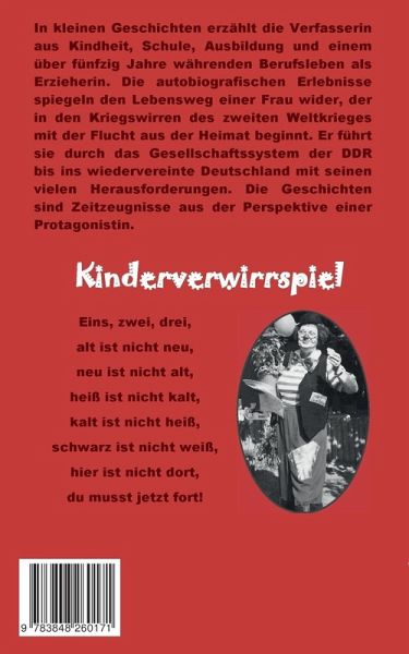 In kleinen, autobiografischen Geschichten erzählt die Verfasserin aus Kindheit, Schule, Ausbildung und einem über fünfzig Jahre währenden Berufsleben als Erzieherin. Das Buch richtet sich an Erwachsene und an junge Menschen, die den Beruf der Erzieherin bzw. des Erziehers ergreifen wollen. Mit dem Namen "Kinderverwirrspiel" möchte die Autorin daran erinnern, dass Kinder durch die Erwachsenen oftmals verwirrt werden, weil sie etwas erleben, was sie nicht verstehen oder was nicht sein darf.Als Erzieherin hat sie sich in der Nachwendezeit für ungewöhnliche Betreuungszeiten über Nacht und am Wochenende eingesetzt. Dieses Thema und die Vereinbarkeit von Familie und Beruf und damit die Gleichberechtigung aller Elternteile sind heute aktueller denn je. Waltraud Sawade beschreibt, dass es auch mit guten Ideen und viel Engagement nicht immer leicht ist, den optimalen Weg für die Kinder und ihre Eltern zu finden. Oft gilt es dabei bürokratische Hürden zu überwinden.Die Autorin hat sich in ihrem Beruf mit Herz und Verstand engagiert, um gute Bedingungen für die Entwicklung der Kinder zu schaffen. Geleitet von der Einsicht, dass in dem Erzieherberuf Theorie und Praxis oft weit auseinanderklaffen, hat sie viele Situationen mit dem Herzen entschieden. Erwachsene würden sich oft schwer tun, richtig im Sinne der Kinder zu handeln. Kinder regelten die Dinge häufig selbst, da jedes Kind eine kleine Persönlichkeit für sich ist, die sich nicht in ein vorgefertigtes Schema zwängen lasse. Waltraud Sawade hält das Vermitteln von Regeln und Normen durch die Erwachsenen für genauso notwendig wie eine Begegnung auf Augenhöhe mit den Kindern. Pädagogische und andere Fehler gehören dazu, es kommt jedoch darauf an, wie mit ihnen umgegangen wird. Der Verfasserin war immer wichtig, jedem Kind, seinen Eltern und seinen Lebensumständen mit Interesse, Aufmerksamkeit und Einfühlungsvermögen zu begegnen.