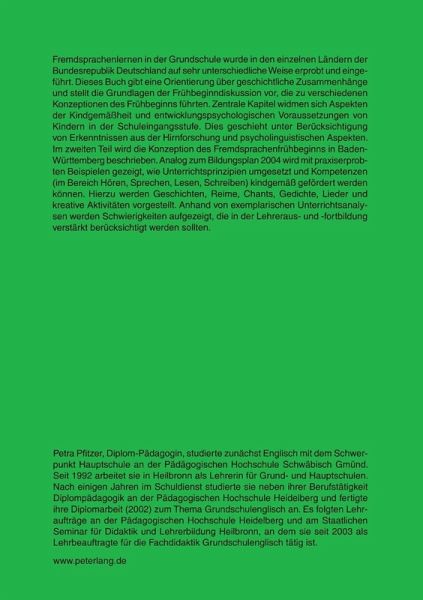 Fremdsprachenlernen in der Grundschule wurde in den einzelnen Ländern der Bundesrepublik Deutschland auf sehr unterschiedliche Weise erprobt und eingeführt. Dieses Buch gibt eine Orientierung über geschichtliche Zusammenhänge und stellt die Grundlagen der Frühbeginndiskussion vor, die zu verschiedenen Konzeptionen des Frühbeginns führten. Zentrale Kapitel widmen sich Aspekten der Kindgemäßheit und entwicklungspsychologischen Voraussetzungen von Kindern in der Schuleingangsstufe. Dies geschieht unter Berücksichtigung von Erkenntnissen aus der Hirnforschung und psycholinguistischen Aspekten. Im zweiten Teil wird die Konzeption des Fremdsprachenfrühbeginns in Baden-Württemberg beschrieben. Analog zum Bildungsplan 2004 wird mit praxiserprobten Beispielen gezeigt, wie Unterrichtsprinzipien umgesetzt und Kompetenzen (im Bereich Hören, Sprechen, Lesen, Schreiben) kindgemäß gefördert werden können. Hierzu werden Geschichten, Reime, Chants, Gedichte, Lieder und kreative Aktivitäten vorgestellt. Anhand von exemplarischen Unterrichtsanalysen werden Schwierigkeiten aufgezeigt, die in der Lehreraus- und -fortbildung verstärkt berücksichtigt werden sollten.