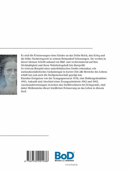 Es sind die Erinnerungen eines Kindes an das Dritte Reich, den Krieg und die frühe Nachkriegszeit in seinem Heimatdorf Schonungen. Sie werden in dieser kleinen Schrift anhand von Bild- und Archivmaterial auf ihre Stichhaltigkeit und ihren Wahrheitsgehalt hin überprüft. So wird am Beispiel eines unterfränkischen Dorfes erkennbar, wie nationalsozialistisches Gedankengut in kurzer Zeit alle Bereiche des Lebens erfaßt hat und auch die Dorfgemeinschaft geprägt hat. Einzelne Ereignisse wie der sog. "Synagogensturm" 1938, eine Heldengedenkfeier 1943, Ankunft und Abschied einer Zwangsarbeiterin 1942 und 1945, gefährliche Auseinandersetzungen zwischen den Dorfbewohnern bei Kriegsende, sind dabei Meilensteine dieser kindlichen Erinnerung an das Leben in diesem Dorf.