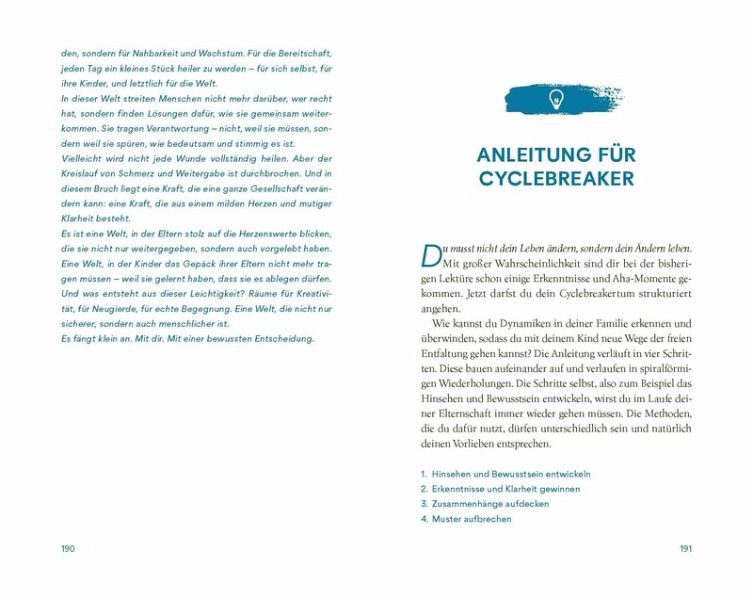 Drohen, schimpfen, strafen, beschämen, ignorieren: Diese Anleitung für Cyclebreaker ermöglicht es Familien, Schritt für Schritt hinderliche und häufig unbewusste Verhaltensmuster und Prägungen wahrzunehmen und aufzulösen. Das Buch ermutigt Eltern mit vielen Fallbeispielen, Impulsen, Übungen und Geschichten dazu, die Gründe für ihr eigenes und das Verhalten ihrer Kinder zu verstehen und mit ganz viel Empathie für alle Familienmitglieder neue Wege im Zusammenleben zu gehen.