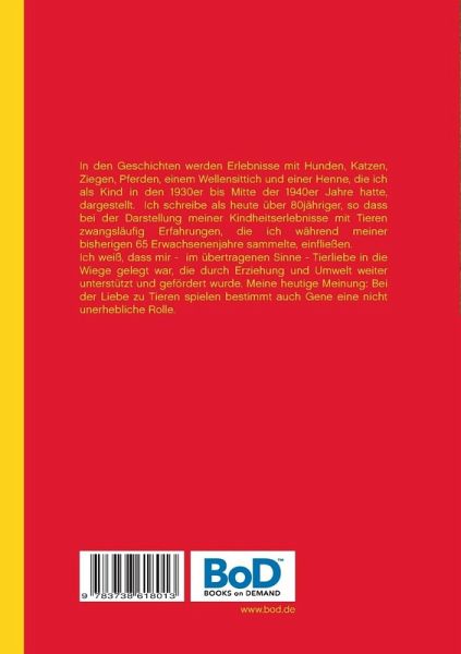 In den Geschichten werden Erlebnisse mit Hunden, Katzen, Ziegen, Pferden, einem Wellensittich und einer Henne, die ich als Kind in den 1930er bis Mitte der 1940er Jahre hatte, dargestellt. Ich schreibe als heute über 80jähriger, so dass bei der Darstellung meiner Kindheitserlebnisse mit Tieren zwangsläufig Erfahrungen, die ich während meiner bisherigen 65 Erwachsenenjahre sammelte, einfließen.Ich weiß, dass mir - im übertragenen Sinne - Tierliebe in die Wiege gelegt war, die durch Erziehung und Umwelt weiter unterstützt und gefördert wurde. Meine heutige Meinung: Bei der Liebe zu Tieren spielen bestimmt auch Gene eine nicht unerhebliche Rolle. In den Geschichten nehmen Probleme des Tierschutzes und der Tierpsychologie einen entsprechenden Platz ein.