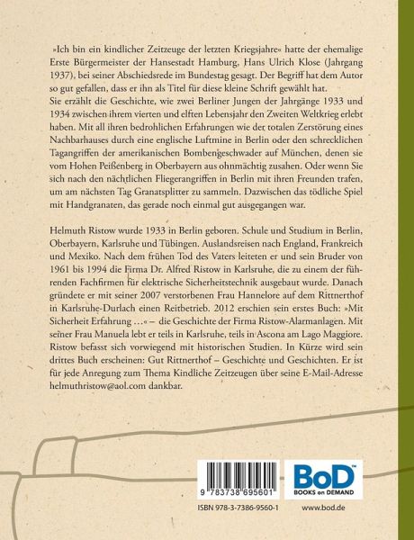 »Ich bin ein kindlicher Zeitzeuge der letzten Kriegsjahre« hatte der ehemalige Erste Bürgermeister der Hansestadt Hamburg, Hans Ulrich Klose (Jahrgang 1937), bei seiner Abschiedsrede im Bundestag gesagt. Der Begriff hat dem Autor so gut gefallen, dass er ihn als Titel für diese kleine Schrift gewählt hat.Sie erzählt die Geschichte, wie zwei Berliner Jungen der Jahrgänge 1933 und 1934 zwischen ihrem vierten und elften Lebensjahr den Zweiten Weltkrieg erlebt haben. Mit all ihren bedrohlichen Erfahrungen wie der totalen Zerstörung eines Nachbarhauses durch eine englische Luftmine in Berlin oder den schrecklichen Tagangriffen der amerikanischen Bombengeschwader auf München, denen sie vom Hohen Peißenberg in Oberbayern aus ohnmächtig zusahen. Oder wenn Sie sich nach den nächtlichen Fliegerangriffen in Berlin mit ihren Freunden trafen, um am nächsten Tag Granatsplitter zu sammeln. Dazwischen das tödliche Spiel mit Handgranaten, das gerade noch einmal gut ausgegangen war.Helmuth Ristow wurde 1933 in Berlin geboren. Schule und Studium in Berlin, Oberbayern, Karlsruhe und Tübingen. Auslandsreisen nach England, Frankreich und Mexiko. Nach dem frühen Tod des Vaters leiteten er und sein Bruder von 1961 bis 1994 die Firma Dr. Alfred Ristow in Karlsruhe, die zu einem der führenden Fachfirmen für elektrische Sicherheitstechnik ausgebaut wurde. Danach gründete er mit seiner 2007 verstorbenen Frau Hannelore auf dem Rittnerthof in Karlsruhe-Durlach einen Reitbetrieb. 2012 erschien sein erstes Buch: »Mit Sicherheit Erfahrung ...« - die Geschichte der Firma Ristow-Alarmanlagen. Mit seiner Frau Manuela lebt er teils in Karlsruhe, teils in Ascona am Lago Maggiore. Ristow befasst sich vorwiegend mit historischen Studien. In Kürze wird sein drittes Buch erscheinen: Gut Rittnerthof - Geschichte und Geschichten. Er ist für jede Anregung zum Thema Kindliche Zeitzeugen über seine E-Mail-Adresse helmuthristow@aol.com dankbar.