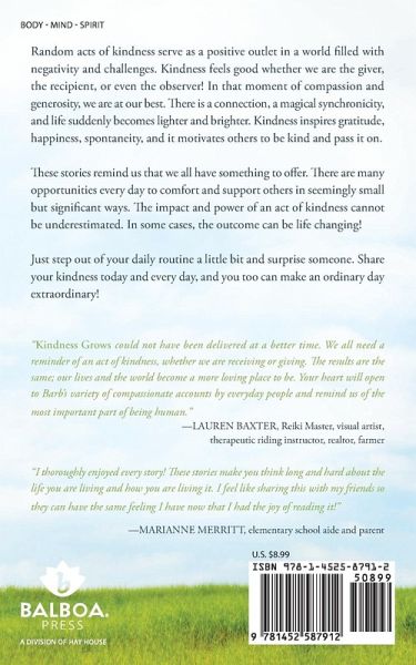 Random acts of kindness serve as a positive outlet in a world filled with negativity and challenges. Kindness feels good whether we are the giver, the recipient, or even the observer! In that moment of compassion and generosity, we are at our best. There is a connection, a magical synchronicity, and life suddenly becomes lighter and brighter. Kindness inspires gratitude, happiness, spontaneity, and it motivates others to be kind and pass it on. These stories remind us that we all have something to offer. There are many opportunities every day to comfort and support others in seemingly small but significant ways. The impact and power of an act of kindness cannot be underestimated. In some cases, the outcome can be life changing! Just step out of your daily routine a little bit and surprise someone. Share your kindness today and every day, and you too can make an ordinary day extraordinary! "Kindness Grows could not have been delivered at a better time. We all need a reminder of an act of kindness, whether we are receiving or giving. The results are the same; our lives and the world become a more loving place to be. Your heart will open to Barb's variety of compassionate accounts by everyday people and remind us of the most important part of being human. " Lauren Baxter, Reiki Master, visual artist, therapeutic riding instructor, realtor, farmer ""I thoroughly enjoyed every story! These stories make you think long and hard about the life you are living and how you are living it. I feel like sharing this with my friends so they can have the same feeling I have now that I had the joy of reading it!" Marianne Merritt, elementary school aide and parent