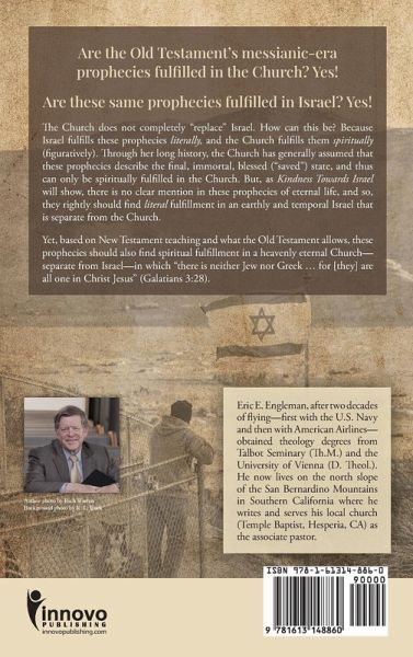 -ABOUT THE BOOK: Are the Old Testament's messianic-era prophecies fulfilled in the Church? Yes! Are these same prophecies fulfilled in Israel? Yes! The Church does not completely "replace" Israel. How can this be? Because Israel fulfills these prophecies literally, and the Church fulfills them spiritually (figuratively). Throughout her long history, the Church has generally assumed that these prophecies describe the final, immortal, blessed ("saved") state, and thus can only be spiritually fulfilled in the Church. But, as Kindness Towards Israel will show, there is no clear mention in these prophecies of eternal life, and so, they rightly should find literal fulfillment in an earthly and temporal Israel that is separate from the Church. Yet, based on New Testament teaching and what the Old Testament allows, these prophecies should also find spiritual fulfillment in a heavenly, eternal Church that is separate from Israel yet consists of both Jews and Gentiles. God will fulfill his promises made to the Jews as well as his promises made to the Church-in which "there is neither Jew nor Greek ... for [they] are all one in Christ Jesus"(Galatians 3:28). -ABOUT THE AUTHOR: After two decades of flying-first with the U.S. Navy and then with American Airlines- Eric E. Engleman obtained theology degrees from Talbot Seminary (Th.M.) and the University of Vienna (D. Theol.). He now lives on the north slope of the San Bernardino Mountains in Southern California where he writes and serves his local church (Temple Baptist, Hesperia, CA) as the associate pastor. -ABOUT THE PUBLISHER: Innovo Publishing LLC is a Christ-centered publisher located near Memphis, TN. Since 2008, Innovo has been publishing quality books, eBooks, audiobooks, music, screenplays, and online and physical curricula that support the Great Commission, equip believers, and help create a positive Christian worldview. Innovo's capabilities and global reach provide Christian authors, artists, and ministries access to the world for Christ. To learn more about Innovo Publishing, visit our website at innovopublishing.com. To connect with other Christian creatives and to learn best practices for creating, publishing, marketing, and selling Christian titles, visit the Christian Publishing Portal at cpportal.com.