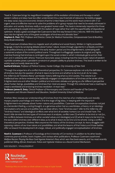 Kindness Wars rescues our understanding of kindness from the clutches of an intellectually and morally myopic popular psychology and returns it to the stage of big ideas, in keeping with the important Enlightenment-era debates about human nature and possibilities. Cazenave conceptualizes kindness not just as a benevolent feeling, a caring thought, or a generous action but as a worldview, a theory, or an ideology that explains who we are and justifies how we treat others. Here "kindness wars" refer to the millennia-old "kindness theory" and ideological conflicts over what kind of societies humans can and should have. The book's title denotes the two types of kindness wars it analyzes, conflict over (1) whether to be kind or not (i.e., the conflicts between kindness and other societal values and ideologies) and (2) what it means to be kind (i.e., the wars within kindness over different ideas as to what it means to be kind and to whom). Using a conflict theoretical perspective, Kindness Wars examines the history of the kindness concept; its many struggles with opposing notions of our true nature and possibilities; and what the lessons of that history and those battles offer us toward the development of a large, robust, and politically engaged conceptualization of kindness.