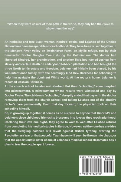 An herbalist and free Black woman, Kindred Twain, and Lelaheo of the Oneida Nation have been inseparable since childhood. They have been raised together in the Mohawk River Valley on Twainhaven Farm, an idyllic refuge, run by their benefactor Doctor Douglas Twain during the Colonial era. The doctor had liberated Kindred, her grandmother, and another little boy named Joshua from slavery and certain death on a Maryland tobacco plantation and had brought the three North to his estate and freedom. Lelaheo had initially been placed, by his well-intentioned family, with the seemingly kind Rev. Harkness for schooling to help him navigate the dominant White world. At the rector's home, Lelaheo is renamed Cassian Harkness. At the church school he also met Kindred. But their "schooling" soon morphed into mistreatment. A mistreatment whose results were witnessed one day by Doctor Twain. The children's "schooling" abruptly ended that day with the doctor removing them from the church school and taking Lelaheo out of the abusive rector's care permanently. From that day forward, the physician took on their schooling himself. So, in growing up together, it comes as no surprise to anyone that Kindred's and Lelaheo's close childhood friendship blossoms into love as they reach adulthood. Declaring their love one night, they agree to wait to wed after Lelaheo returns from completing his medical studies in Europe. However, neither one has any idea that the fledgling colonies will revolt against British tyranny, starting the Revolutionary War or that peaceful Twainhaven will soon be thrown into chaos, or that the opportunistic sister of one of Lelaheo's medical school classmates has a plan to tear the couple apart forever.